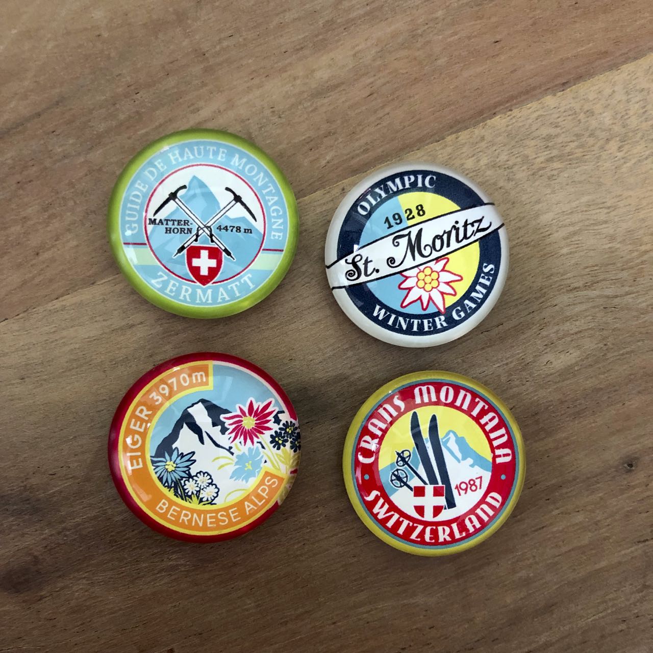 Set van 4 magneetjes met een verschillend alpine design. Formaat: Ø 3.5 x 1.3 cm. Materiaal: glas, magneet. Sterkte magneet: 3: sterke ‘Steely’ magneten