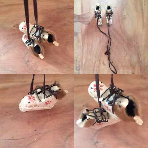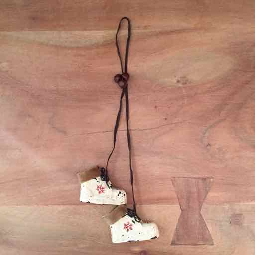 Decoratieve hanger met skischoenen uit de collectie van Chehoma. De skischoenen hangen aan een leren koordje met een belletje eraan.