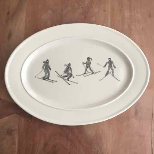 Ovalen schaal met 4 skiers  met een afmeting van 25 x 35.4 cm. De schaal kan in de vaatwasser en is magnetronbestendig.